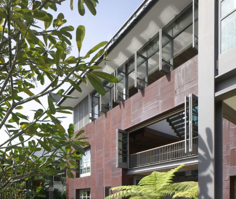 Sunshine beach house in Queensland was completed in late 2011 designed as a singular family home for its owner returning from overseas. Located on Sunshine coast’s longest and best surf beach with year-round sunny weather, the two-storey house with a partial lower level consists of 3 volumes. The house is designed with the sub tropical climate in mind as well as passive cooling and heating. Sandstone feature walls screen direct and guide visitors to the arrival as well as protect and screen. A “barcode” wall screens entrance from northerly neighbours and the solid walls run parallel forms the winter court to the bedroom block; other such walls screen and frame vignettes to the ocean from all bathrooms. Large seamless living and dining block runs north south facing out to the easterly (ocean) view opens out onto a sundeck and pool absorbing dramatic Noosa sunrise and Pacific Ocean. Large expanses of decks to the North and roof top allow for entertaining guests all year round. All sundry spaces and hallways are designed to attain natural daylight and a hierarchy of alcoves to display owner’s extensive South East Asian art and sculpture collection.